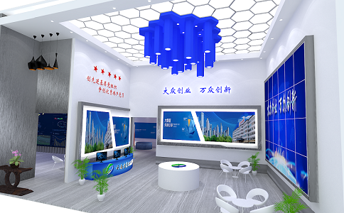 二、雙創(chuàng)平臺(tái)展廳:了解大數(shù)據(jù)展廳后右邊強(qiáng)面很醒目的“眾”字創(chuàng)意發(fā)光造型。不明思意“大眾創(chuàng)業(yè),萬(wàn)眾創(chuàng)業(yè)”;采用文化藝術(shù)墻加內(nèi)發(fā)光字簡(jiǎn)單簡(jiǎn)潔。此文化墻主要是把兩個(gè)區(qū)域分隔起到隔音獨(dú)立的參觀工作空間。通過(guò)一個(gè)小玄關(guān)到達(dá)雙創(chuàng)展廳。玄關(guān)處放置一個(gè)應(yīng)景臺(tái)增加展廳的氛圍。頂部是六邊形發(fā)光軟膜增加展廳內(nèi)的亮度和創(chuàng)業(yè)的相互照應(yīng),頂部中間是六邊形的高低有續(xù)燈塔燈(意義:創(chuàng)業(yè)企業(yè)緊密團(tuán)結(jié)在集團(tuán)下共同發(fā)展,發(fā)展有節(jié)奏感)。正面是24方的一個(gè)高清全彩LED液晶顯示屏,背面就操控操作臺(tái)系統(tǒng)和燈箱展示面及黨建標(biāo)語(yǔ)。左右兩則燈箱分別用燈箱展示雙創(chuàng)的政策的優(yōu)勢(shì)。