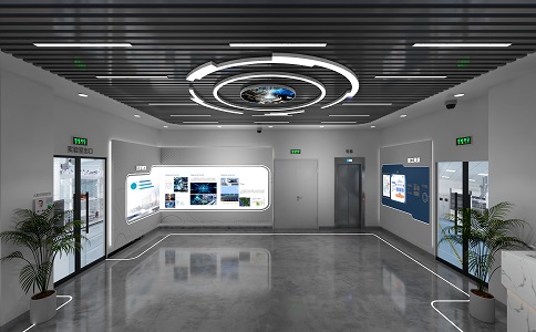內部頂造型:軟膜天空吊頂+LED線性燈帶凸顯展廳高端大氣。LED高清液晶屏,人臉識別系統(tǒng)、展廳接待沙發(fā)+茶幾。