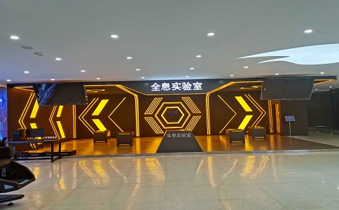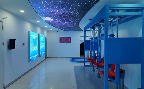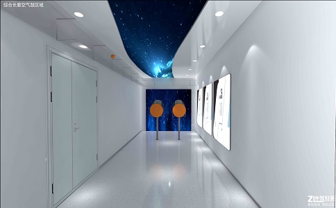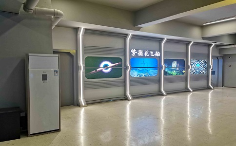 采用160°水平視角環(huán)幕, 24㎡超大觀影體驗(yàn),支持300萬(wàn) 面超大規(guī)模虛擬現(xiàn)實(shí)場(chǎng)景實(shí)時(shí) 漫游,4160*1440 屏幕分辨率 高清數(shù)字媒體播放。墻上展現(xiàn) 了紫薇花飛船的編年史,增加 科技感。